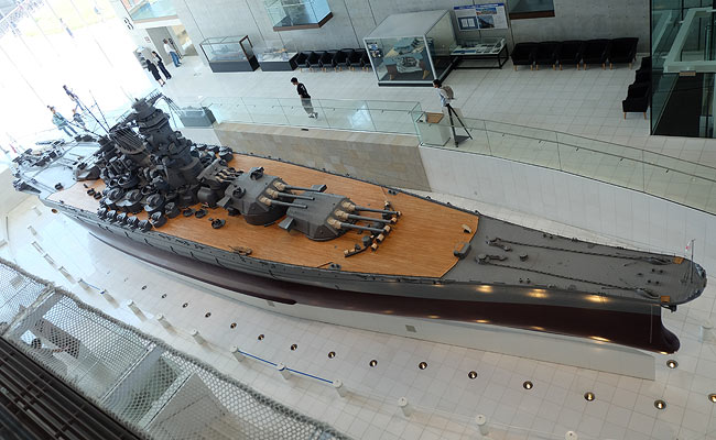 最大の呼び物は、もちろんこの1/10スケールの戦艦大和だ。全長26.3メートル。学校にあるプールに浮かべることもできないほどの大きさ。写真でも、人物との対比でその大きさがわかるだろう。1/10戦艦大和はミュージアム1階に展示されているが、1階からではあまりの大きさにその全体像を見ることはできない。建物は吹き抜けになっており、2階、3階から見下ろすことではじめてその雄大な実像に触れることができる。