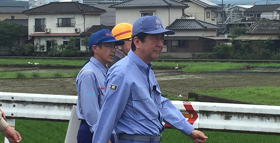 12日、安倍晋三総理大臣は日田市と朝倉市を訪れ、被災地の視察や地元自治体首長との意見交換を行った。写真はJR九州・九大本線の鉄橋が流された現場を視察する安倍首相。