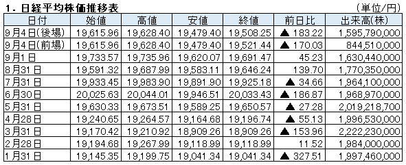 ・週明け4日の日経平均株価は、始値は前日比▲75円51銭の1万9,615円96銭だったが、その後下げ幅を拡大。前場の最安値は前日比▲212円7銭の1万9,479円40銭となり、一つの目安である1万9,500円を割り込んだ。その後やや値を戻し、前場は前日比▲170円3銭の1万9,521円44銭で取引を終えた。
