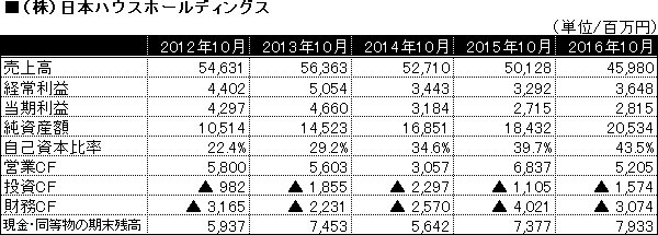次にミサワホーム、日本ハウスホールディングス、住友林業の業績推移とキャッシュフローの状況について見てみよう。数値はいずれも連結である。