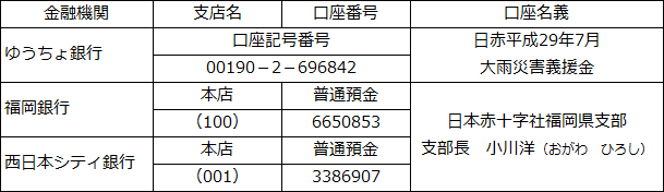 なお、福岡県共同募金会および日本赤十字社福岡県支部で受付した義援金は、税制優遇措置の対象になる。ただし、福岡県庁で受付した義援金については、税制優遇措置の対象外。
