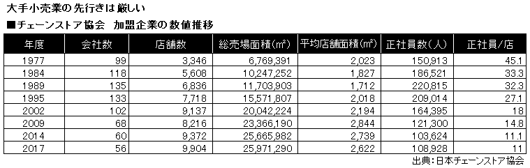 表はチェーンストア協会データによる加盟企業の数値推移である。昭和40年代(1965~)に産声を上げた日本型大型店は文字通り日本の消費生活を一変させる。多くのお客がそこに押しかけ、半ば奪い合うようにモノを買った。しかし、それは今や昔の話だ。表から見てとれるように、店舗数こそわずかに増えているが、ほかの数値は停滞している。1店舗あたりの年間売上は13億円。1m2あたりの売上高は約50万円。40年前に比べて店舗売上で80%、坪あたり売上に至っては62%である。これでは販売による利益は手にできない。表が物語るのはまさにリアル店舗時代の終わりの始まりだ。