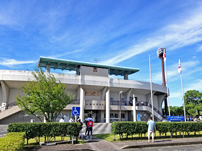 6日の大雨による冠水で被害を受けた「イオン小郡ショッピングセンター」。その東側にある「小郡市野球場」は試合に影響するような被害はなく、現在予定通り高校野球南福岡大会が行われている。