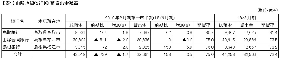 山陰地方とは中国山脈の北側に位置する島根県、鳥取県と山口県・兵庫県・京都府の北部で、いわれは五畿七道の山陰道からきている。今は島根・鳥取の二県を指すことが多い。その山陰に本店がある地銀は山陰合同銀行(島根県松江市)・鳥取銀行(鳥取県鳥取市)・島根銀行(島根県松江市)の3行で、その預貸金計数は【表1】の通り、一強二弱となっている。
