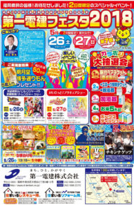 第一電建(株)(本社:福岡市博多区、高山幸治代表)は5月26日、27日、「第一電建フェスタ2018」を開催する。期間中、会場となる本社では家電の特価販売を始め、子どもが一日中楽しめるイベントのほか、「高所作業車」体験コーナーなども企画している。開催は今回で7回目、地域の恒例イベントとなっている。