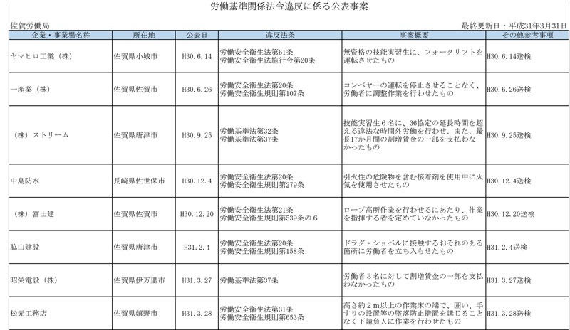 厚生労働省は17年5月から、労働基準関係法令に違反し書類送検された企業の一覧表をホームページに掲載している。19年4月26日に公表(19年3月31日更新分)された福岡を除く九州地区分は下記の通り。