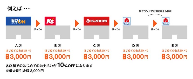 期間中、対象店舗で初めてOrigami Payで支払うと10%OFFとなる。割引金額の上限は3,000円だが、店舗単位でそれぞれ初回支払いが対象となる。たとえば家電量販店A店での初回支払いで10%OFFとなった後、同じ家電量販店のB店でも初回支払いは10%OFFとなる。ただし、キャンペーン以前に支払いをしたことがある店舗は割引対象外。