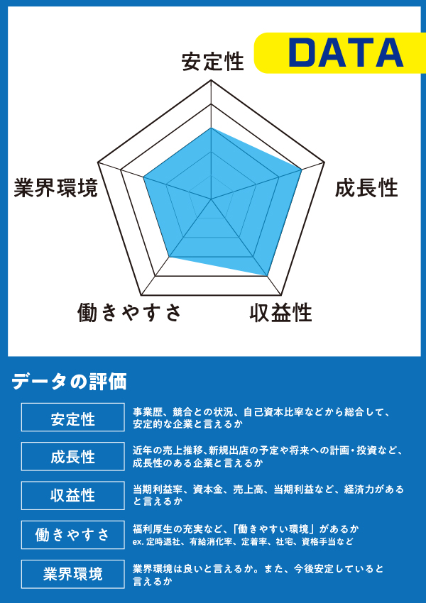 基本データ(事業歴、経営者信用など)事業データ(事業の規模、将来性など)設備データ(所有資産、設備など)経営データ(収益性、財務体質など)を基に弊社独自の格付けでSランク、Aランクのみ掲載(Aランクの下限は60点、平均的な企業は52~54点)。