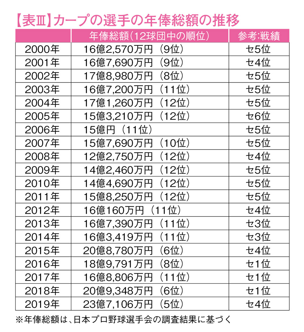 これを見る限り、やはり以前のカープの選手たちの年俸は破格に安かったといえるだろう。とくに選手の年俸総額が12球団中10〜12位を推移していた2003年から2014年にかけては、この間に戦績がセ・リーグの最下位に沈んだのは1度だけなのに、選手の年俸総額が12球団のなかで最下位になった年が6度もある。この事実は戦績に関係なく、選手の年俸が安く抑えられていたことを示している。