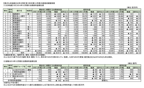 【表2】を見ていただきたい。九州地銀(18行)の20年3月期 第三四半期(12月期)の当期純利益順位表である。1位~6位までは第一地銀が占めている。