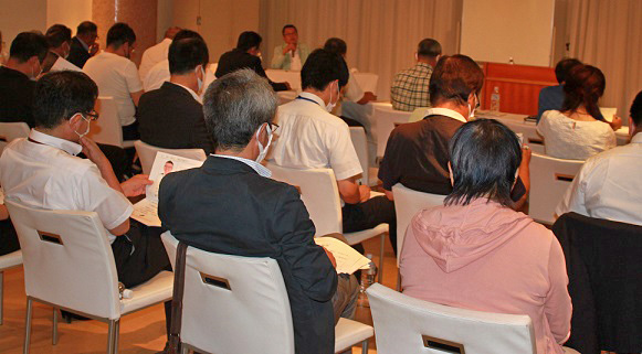 | 「佐賀県フル規格促進議員の会」は、長崎新幹線のフル規格メリットを紹介する勉強会を開いて着工を求める。参加者は40人弱。左手奥が、講演する平原嘉徳佐賀市議=7月31日、佐賀県嬉野町の「和多屋別荘 コットンクラブ」 |