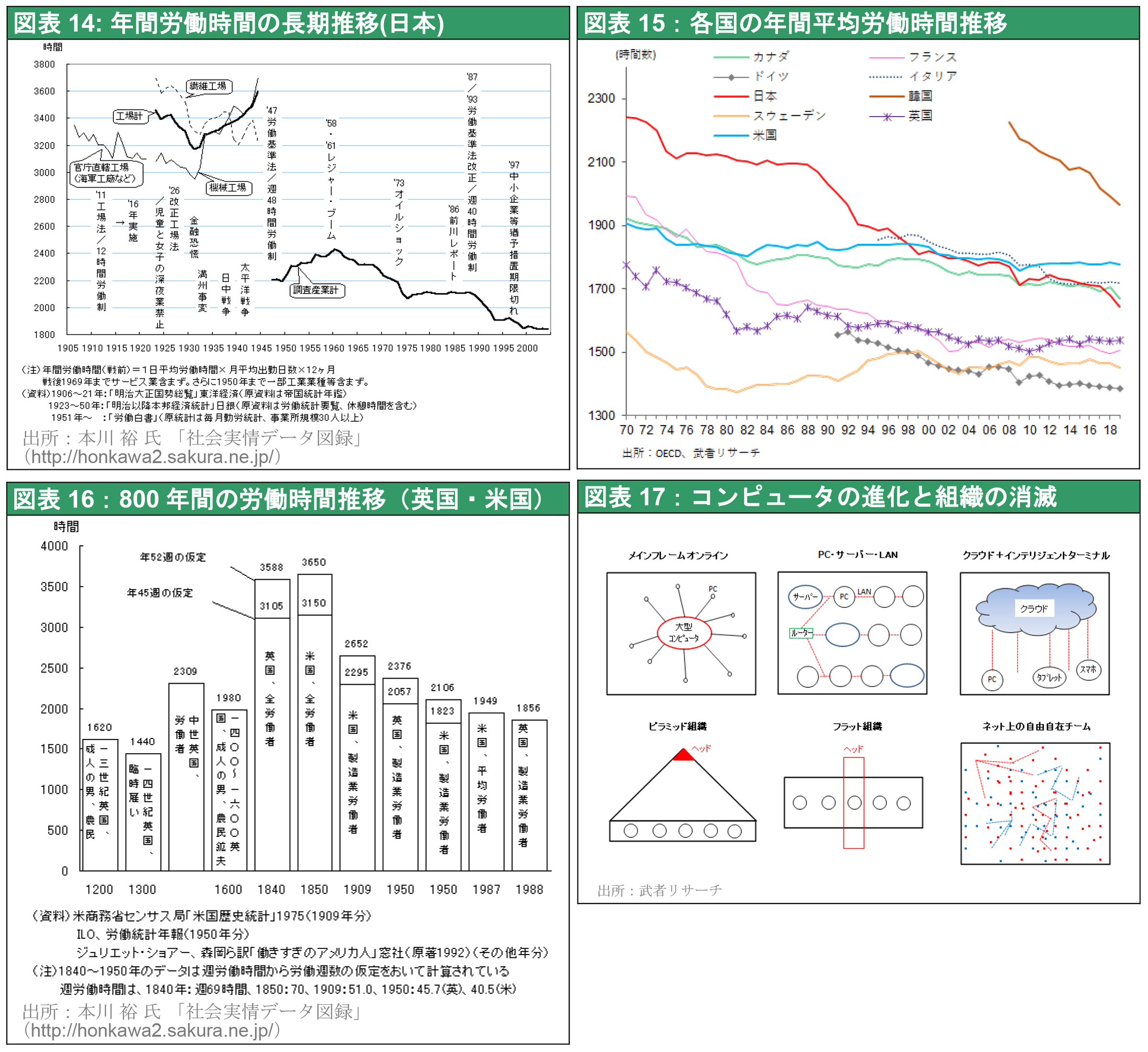 1919年に創設されたILO第1号条約で謳われている、週48時間労働が100年経った今も達成されていない。労働生産性が100年で10倍も上昇したにもかかわらず、人類の労働時間はほとんど変わっておらず、生産と消費のバランスが著しく崩れてしまった。図表16に見るように、人類の技術と生産力はこれほど高まったにもかかわらず、労働時間だけは中世からあまり変わっていないことは不思議である。