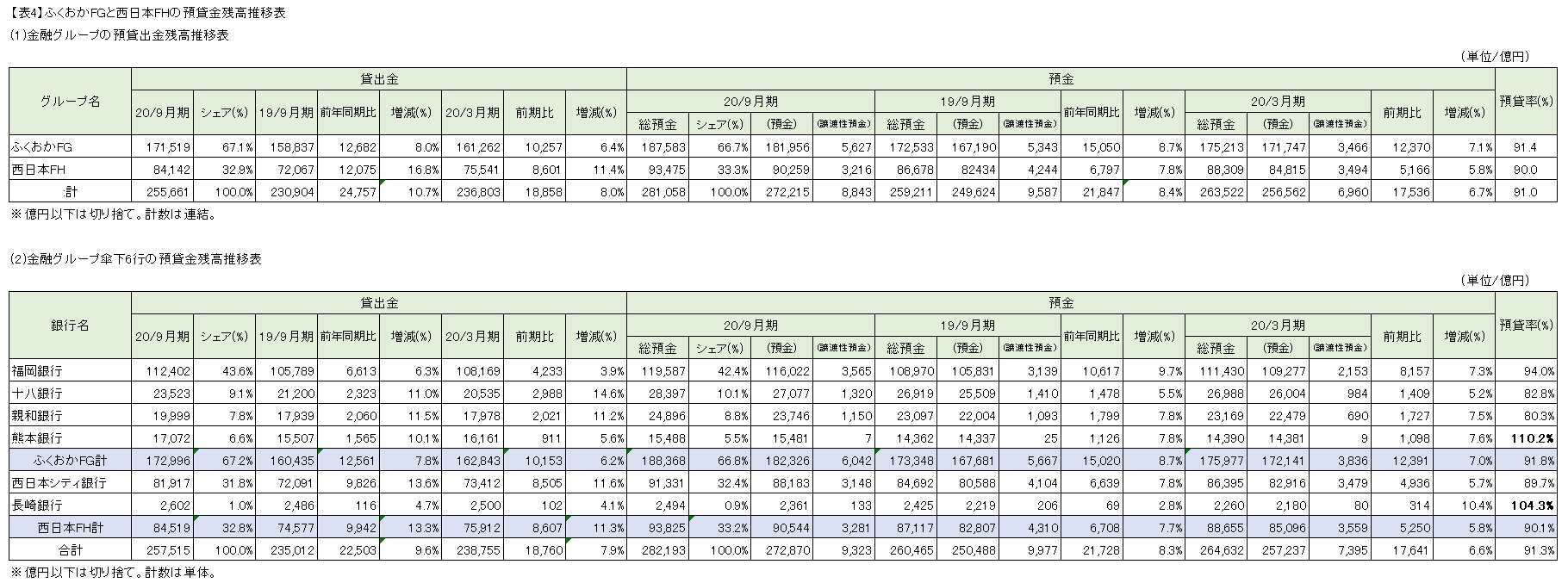 ◆ふくおかFGの20年9月期の貸出金のシェアは67.1%。西日本FHは32.9%で、ほぼ1/2の比率となっている。預金残高はふくおかFGの66.7%に対して西日本FHは33.3%となっている。
