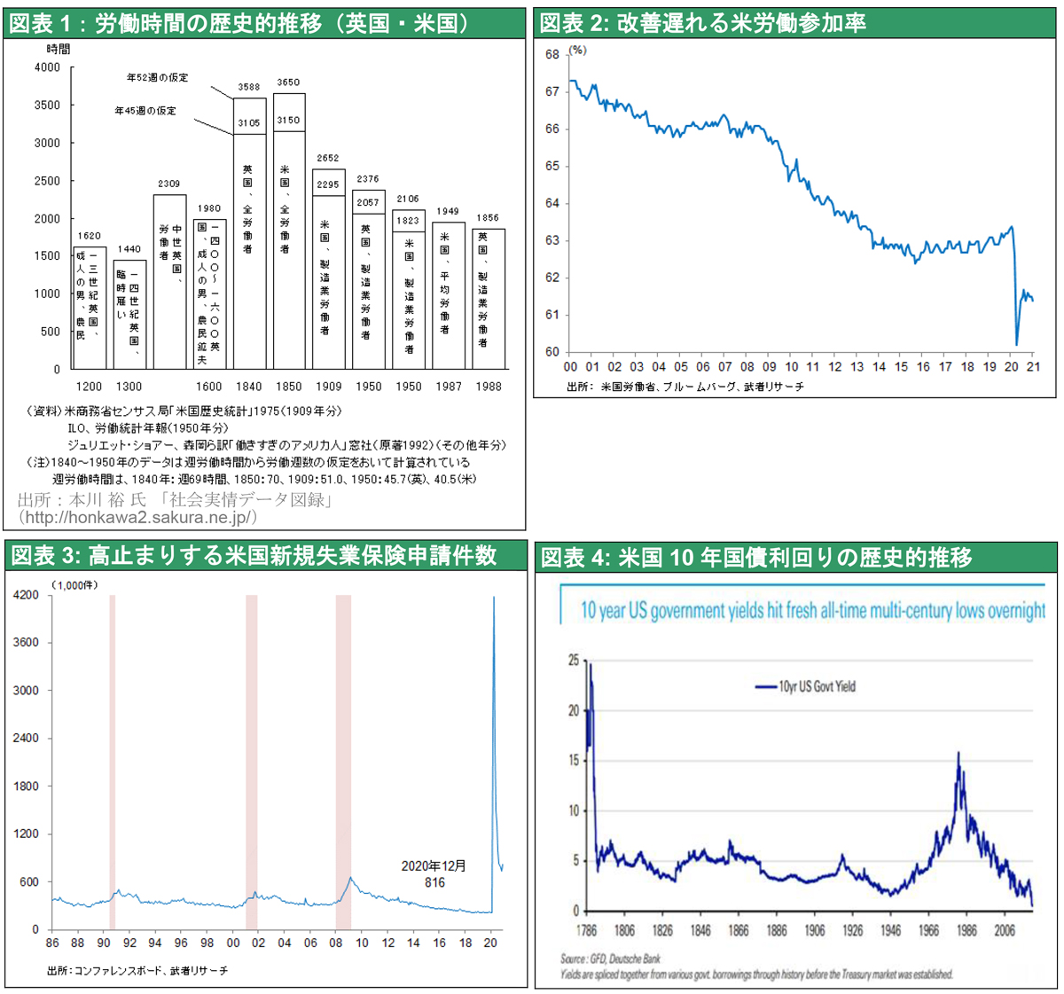 他方、企業は労働時間の短縮をする代わりに、雇用の削減によりコストを抑えようとするだろう。それが進行すれば大恐慌並みの大不況に陥る危険性も出てくる。先進国の中で景気の回復ペースがもっとも順調な米国でも、コロナ前の水準に雇用は戻らないかもしれない。図表2、3に見るように、労働参加率、新規失業保険申請件数の改善が停滞しており、FRBや財務省はこれを懸念している。だから、新規需要創造(=雇用創造)が政府によって担われる必要性が出てくる。