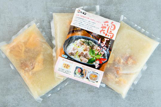 同社が開発・販売している冷凍タイプの『大野城市郷土料理 鶏ぼっかけ』(250g×3袋、税込1,620円)は、しょうゆベースのスープでつくることが多い鶏ぼっかけを、鶏ガラ・鶏肉ともに福岡県銘柄鶏「はかた一番どり」を100%使用した鶏ガラ白濁スープで仕上げた。冷凍タイプにすることで、出来立てのおいしさを損なうことなく鶏本来の旨みをギュッと濃縮。調理も湯煎だけの手間いらず。