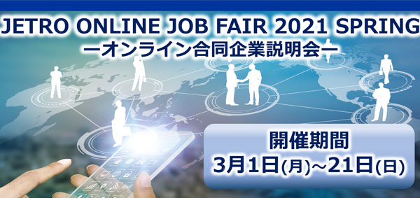 ジェトロ(日本貿易振興機構、JETRO)は、コロナ禍でも積極的に海外ビジネスの拡大を計画する国内中堅・中小企業と外国人留学生、高度外国人材(以下、外国人材)を支援するため、両者を結ぶ常設型のオンライン合同企業説明会「ジェトロ・オンライン・ジョブフェア2021春(JETRO ONLINE JOB FAIR 2021 SPRING)」を6日から21日まで開催する。
