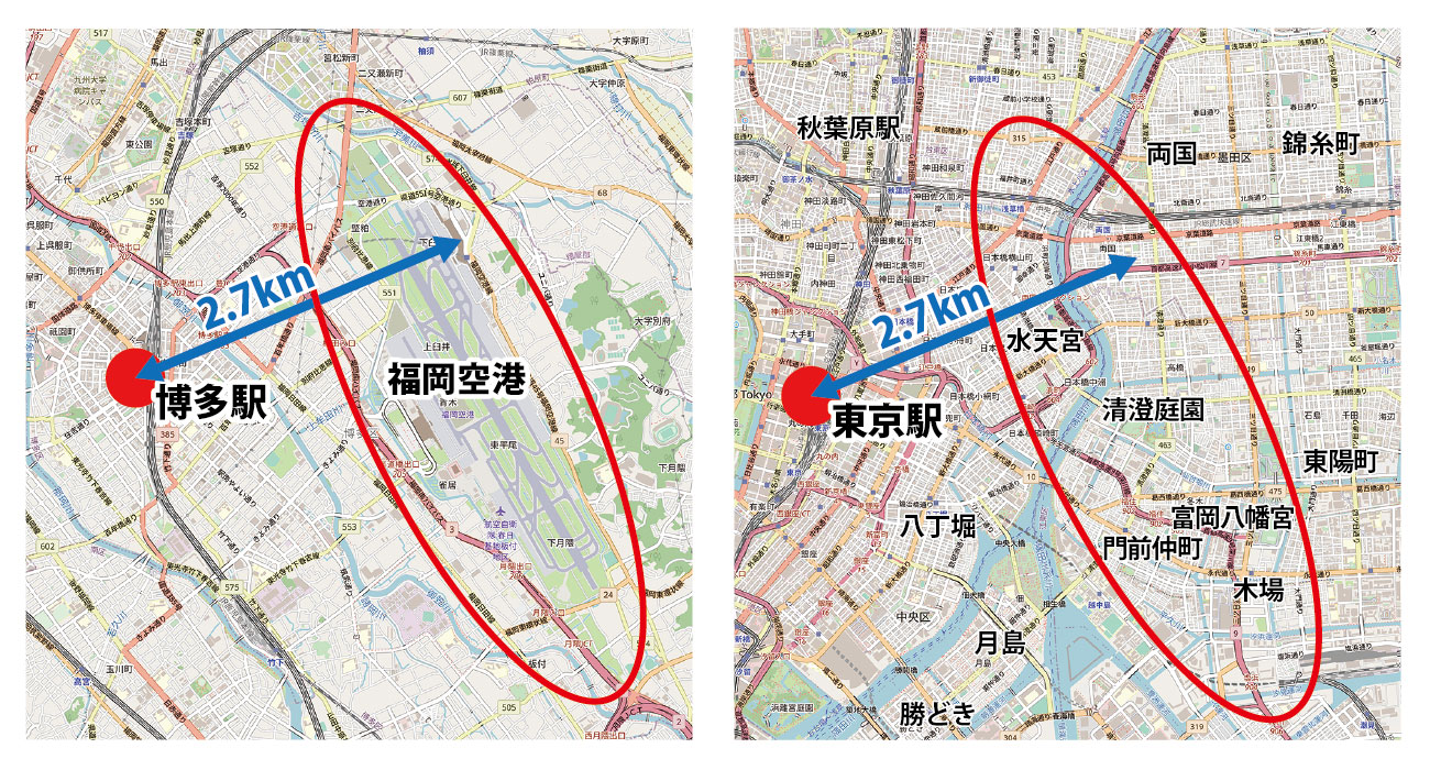 博多駅と福岡空港の位置関係を、東京駅に置き換えて比較すると、下記図のようになる。