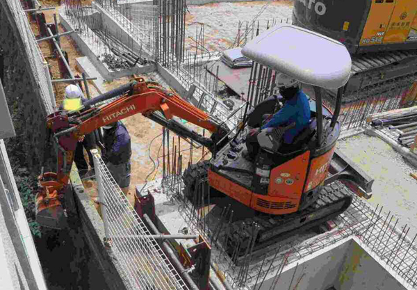 応急措置の際に、ショベルカーのバケット部分が隣地の「クレスト小笹」の壁面から10cm 程度の距離まで境界線を越えて不法侵入している(写真参照)が、「クレスト小笹」の敷地内に侵入して作業することについて、田中構造設計は事前の説明や告知を行っておらず、事後の謝罪や説明もない。
