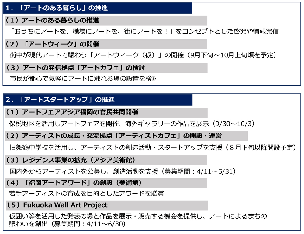 福岡市はアートの展示やイベントなどによるプロモーションを実施するほか、福岡市で活躍しているアーティストの作品を月初めの定例会見などで紹介するとしている。現在、「福岡アジア美術館レジデンス事業アーティスト」と「Fukuoka Wall Art Project作品および民間協力施設」をそれぞれ募集している。
