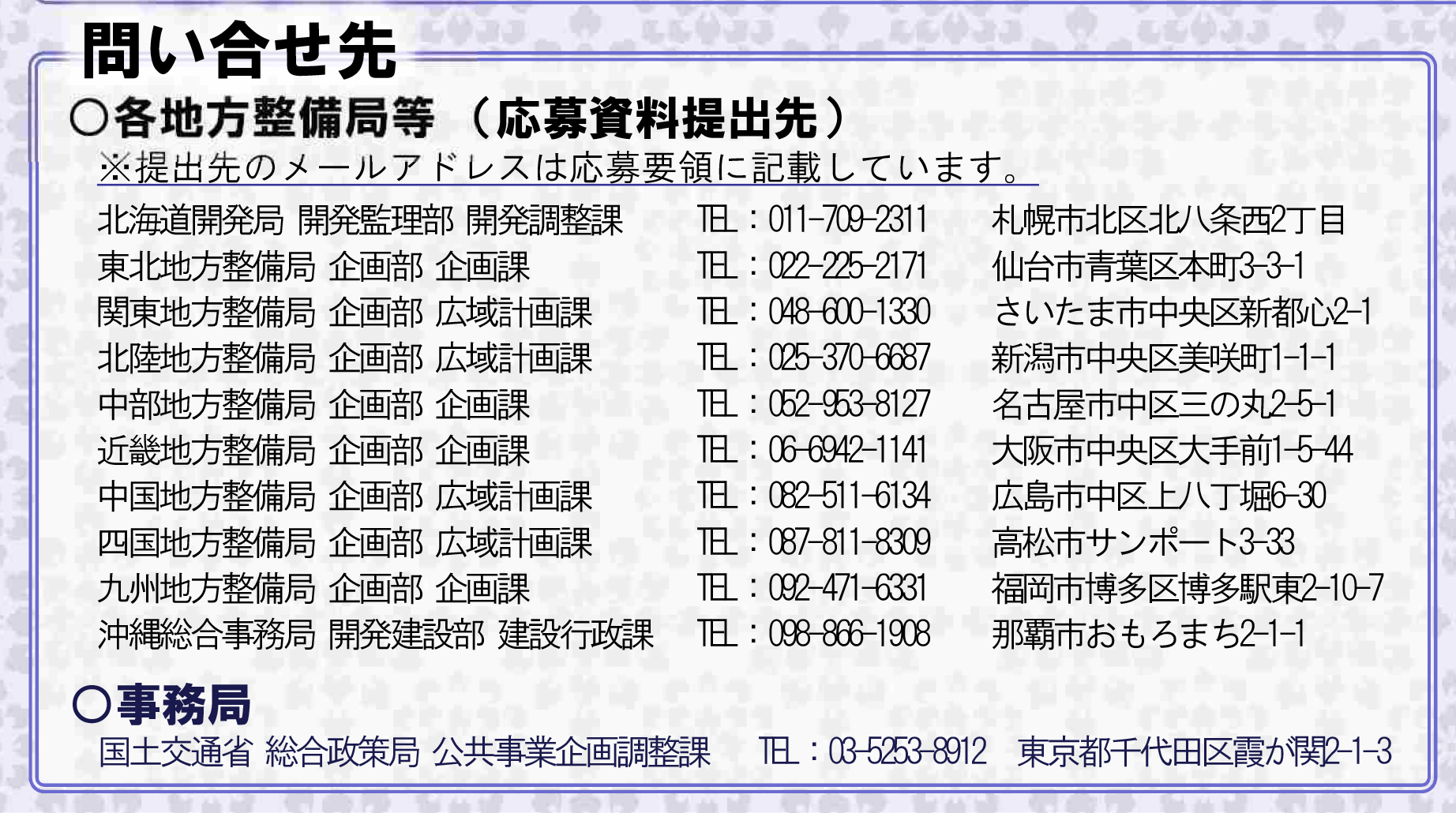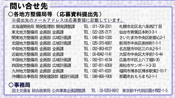 募集対象:地域の魅力や個性を創出している良質な社会資本およびそれと関わりのある優れた地域活動を一体的に表彰する「手づくり郷土賞(一般部門)」と、これまでに受賞したものの、うち一層の発展のあったものを表彰する「手づくり郷土賞(大賞部門)」の2部門にて実施。