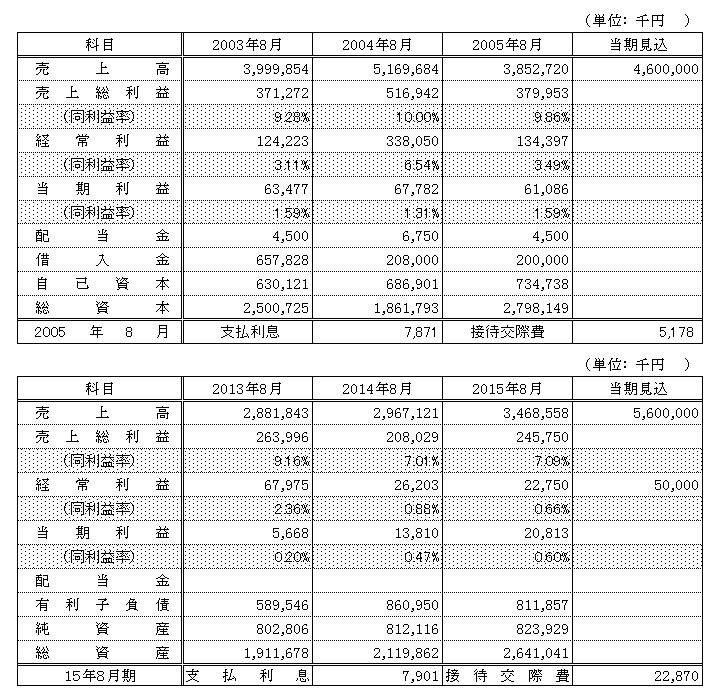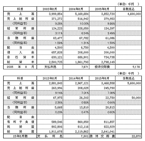 一番の問題は総資産の水膨れである。前者の04年売上ピーク51億円を超えているときの総資産額は18億6,000万円台である。総資本回転率2.7倍という驚異的な数字だ。まさしく軽武装という理想の形であろう。ところが後者の場合、15年の例をとれば売上34億7,000万円に対して総資産26億4,100万円と回転率が1.3倍と半分に落ち込んでいるのだ。また利益がでていないのに15年8月期2,287万円使っている。2005年では518万円の支出しかない。すべての財務内容の劣化は如何ともしがたい。