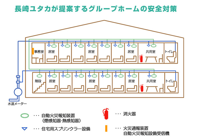 全国的に消防団員の数が減少しているなか、消防車が容易に入っていけない斜面地の建物が多い長崎県において、初期消火と火の広がりを抑制するうえで、スプリンクラー消火設備が果たす役割は大きい。だが、ポンプやタンクなどを必要とするスプリンクラーは、多額の設置費用がかかるため、かつて設置が義務付けられていなかった小規模の社会福祉施設では普及せず、そうした未設置の施設で尊い犠牲をともなう火災が度々発生した。