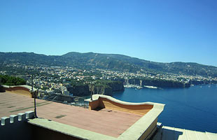 ソレントの市街地は海沿いに切り立った崖上に広がっており、崖には、びっしりとホテルなどの建物が立ち並んでいるのが分かる。背後にはレモンやオリーブの茂る自然が広がっている。