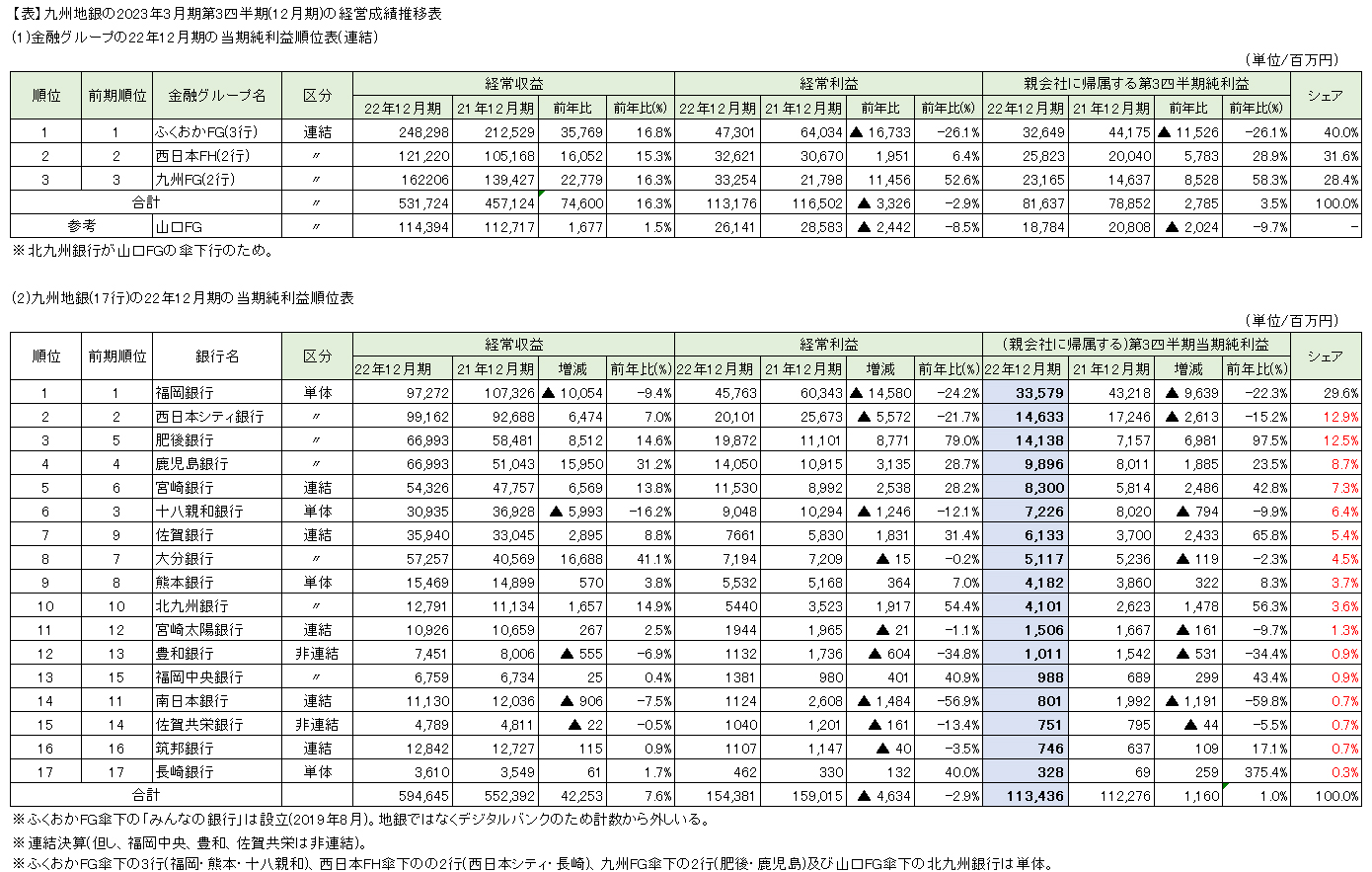 【表】は九州地銀17行(含むFG・FH)の2023年3月期第3四半期(12月期)の経営成績推移表である。なお、ふくおかFG傘下の「みんなの銀行」は、新しい形態の銀行(デジタルバンク)であり、計数から外している。