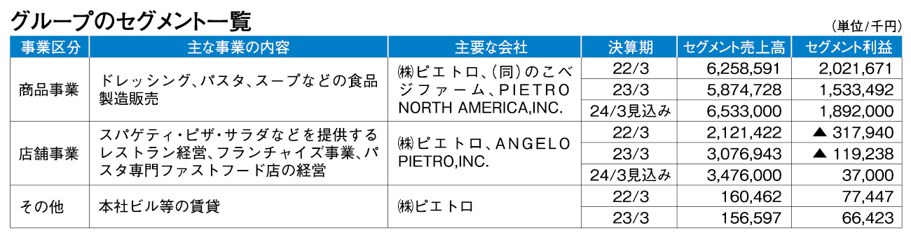 店舗事業では、創業以来日本人の食の好みに合わせて高菜や納豆、たらこ等の和風素材を取り入れたメニューをはじめ、常に新しいオリジナリティをもたせたメニューの開発を継続しながら、パスタを中心とした料理を提供。既存のレストラン店舗のほか、「PIETRO A DAY」ブランド等の直販店舗を、東北エリアを除く国内のすべてのエリアに展開するほか、米国ハワイ州にパスタ料理の直営店を1店出している。23年3月期末時点での店舗数は、直営店23店(うち海外1店)、FC店12店、直販店6店の計41店。