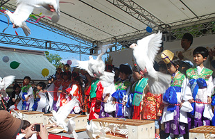 放生神事にあたり、田村邦明権宮司は「これからの世の中を担う若いお子様方、これからもしっかりと命を輝かせて素晴らしい人生を送っていただきたいと思う」と挨拶。子どもたちは絵馬殿前の池で鯉の稚魚を、特設ステージで鳩を、「1、2、3、放生!」の掛け声とともに一斉に放った。その後、福岡の企業13社が奉納したお菓子を受け取り、嬉しそうに帰っていた。