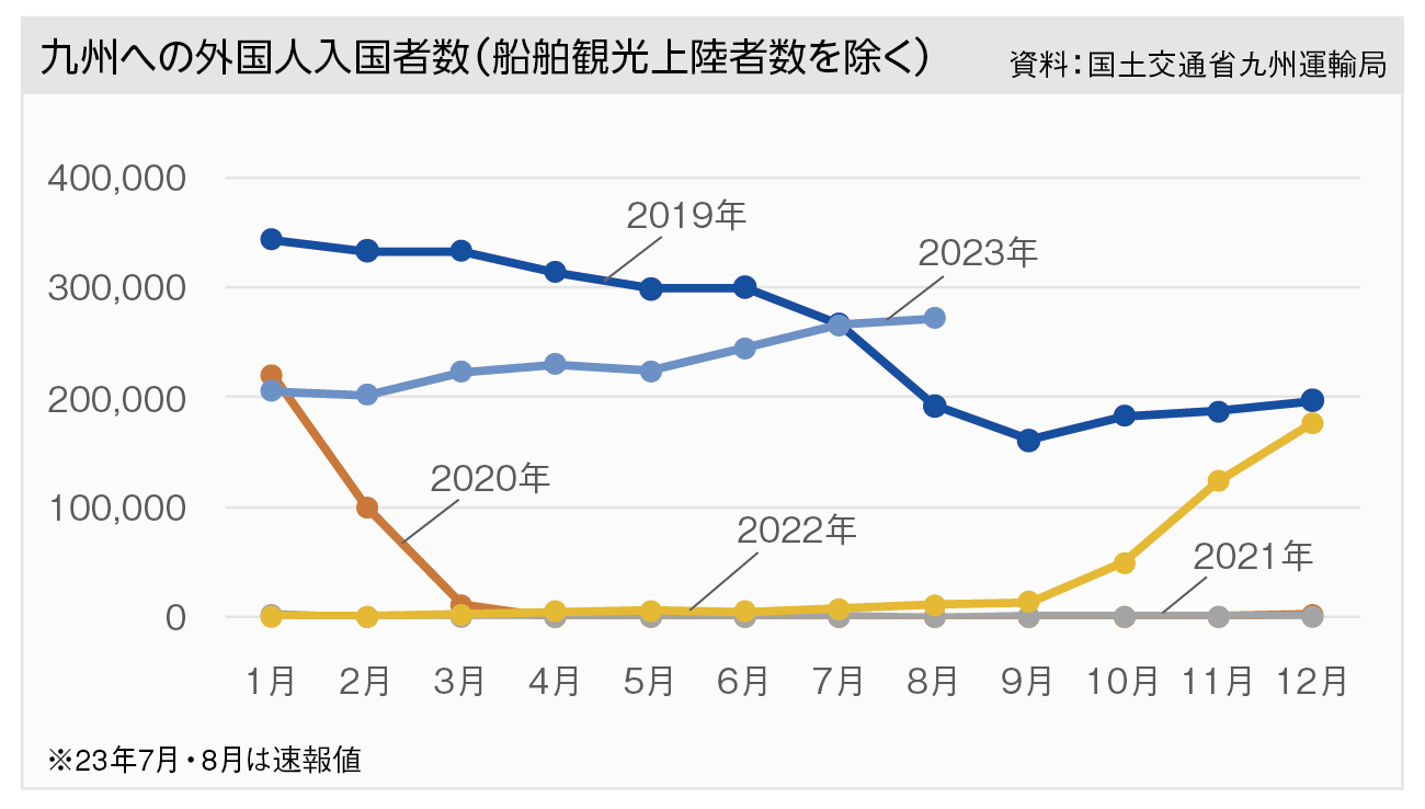 国土交通省九州運輸局によれば、7月の九州への外国人入国者数は26万6,019人(速報値)を数え、2019年7月の通常入国数(船舶観光除く)の水準とほぼ同等にまで回復。全国平均は同月比で83.6%となっており、とくに九州では回復傾向が顕著となっている。8月は27万2,036人(速報値)と今年最多をさらに更新し、日韓関係悪化の影響があった19年8月との比較では、41.2%増と大幅な上昇となった。