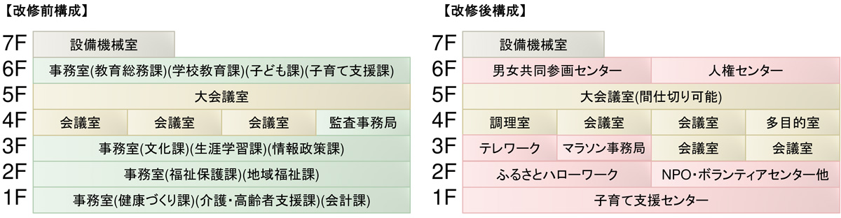 (仮称)市民・人権センターは、分散している①男女共同参画センター「ラポール」、②人権センター、③子育て支援センター「すくすく」、④NPO・ボランティアセンター、⑤テレワークセンター、⑥ふるさとハローワーク、⑦福岡マラソン糸島協力会事務所、⑧前原書庫の8施設を新館に集約。これにより、新館をまちづくりへの市民参画を促進し、就労、子育て支援などの機能を併せもった複合施設として再整備する。