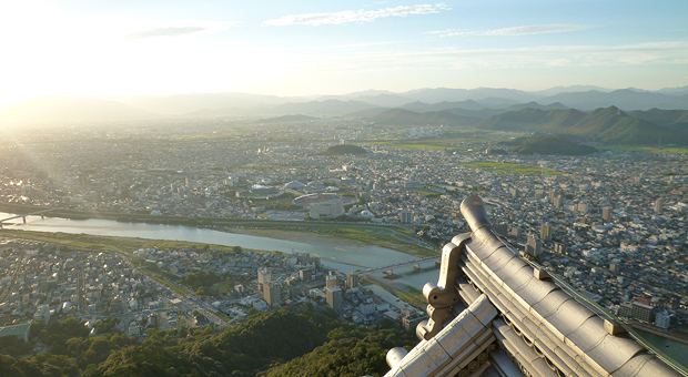 屋根の一部に「平成9年改修」と彫られたものを見つけた。“なるほど、美しいはずだ”と、改めて納得すると同時に、この景色とは対照的に冷たく無機質な城内部の造りを思い出し一人嘆く。沈む夕日が美しい。岐阜城はパノラマ夜景が見所の一つだと聞いていたが、そういう気分にはなれなかったので、次回へ持ち越すことにする。
