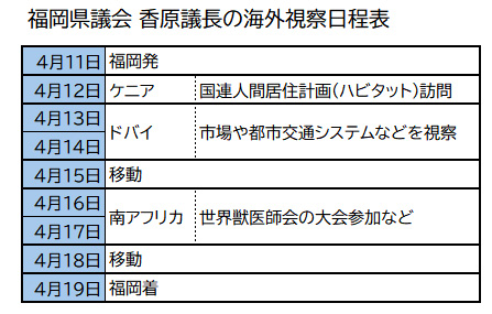 福岡県議会の主要会派の代表などが、4月に南アフリカなどを公費で視察・訪問したことが問題となっている。主な目的は、次期世界獣医師会会長に、蔵内勇夫県議の就任が決定した大会への出席であり、議員外交のはたす役割は小さくない。