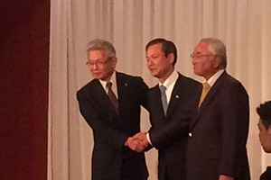 (左から)握手する岩見会長、山喜多専務、渡邉社長 |