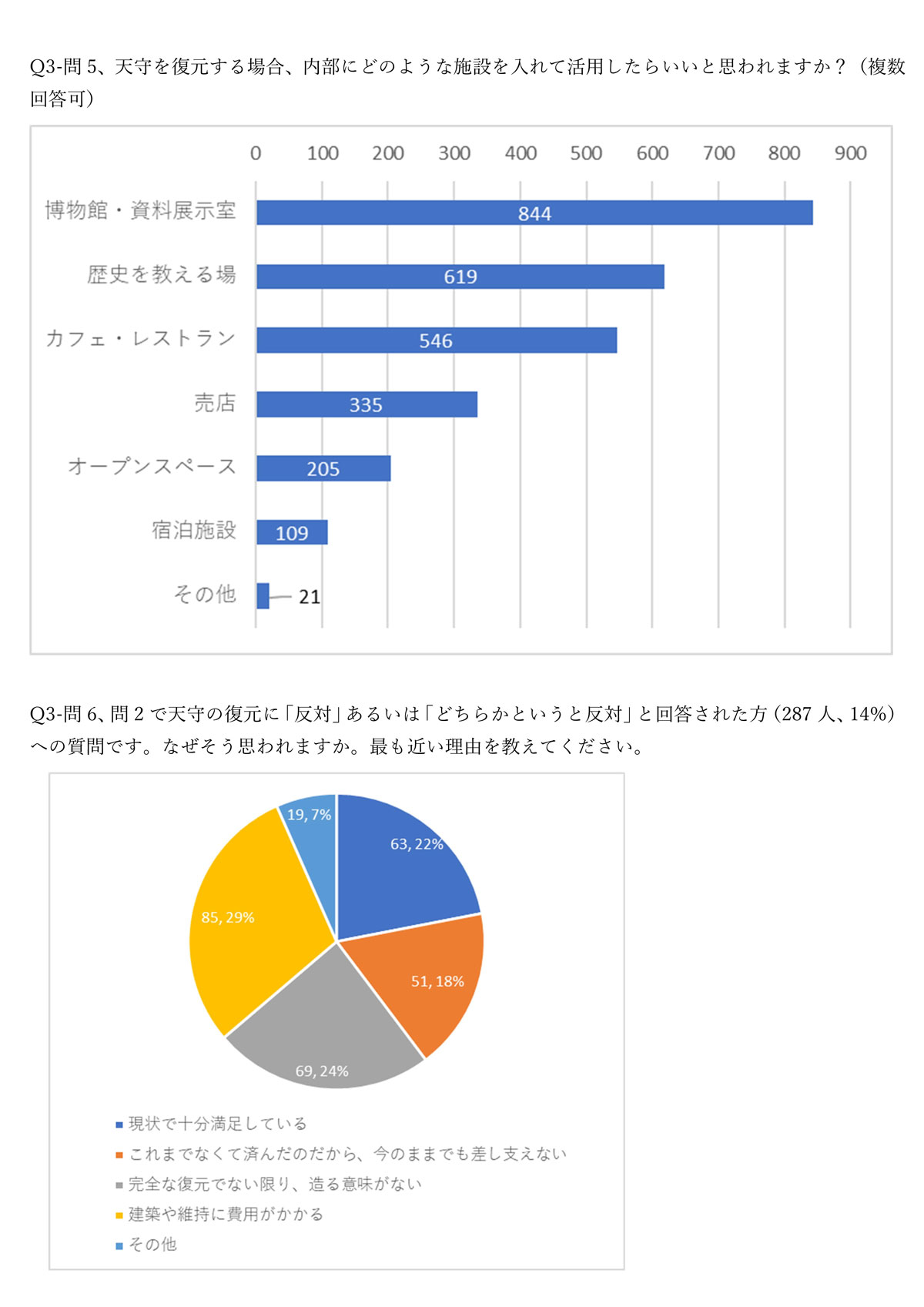 天守の復元について尋ねたQ3-問4で、市民の回答が「過去に存在したものにできるだけ忠実なもの」を重視していることは重要だ。どのような根拠に基づいて、どのようにできる限り忠実な天守の復元を検討しているのか、広く情報を公開することが必要だろう。