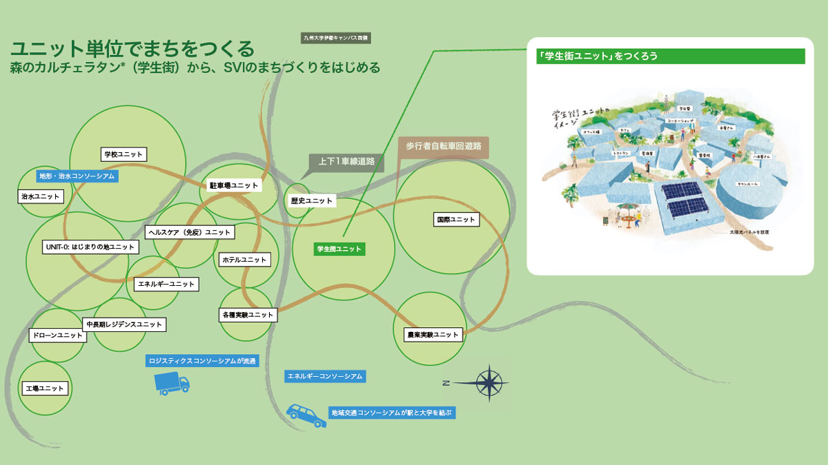 SVI構想の事業主体となる企業の設立が待たれるなか、24年6月、ついにイトシマ(株)が設立され、本格始動をはたすと、同年10月には、SVI構想を推進する中核組織、(一社)SVI推進協議会にKDDI(株)や(株)奥村組など4社が加入。伊都キャンパスの西側隣接地(志摩馬場地区)に、九大や企業、研究機関が新技術の実用化・事業化を目指し共創する場を整備するという同構想は、その実現可能性を高めることになった。現時点の想定であり、確定したものではないが、学生街、エネルギー、ヘルスケア(免疫)、ホテルなど、それぞれ特徴をもった区域(ユニット)も設けられる方針だ。