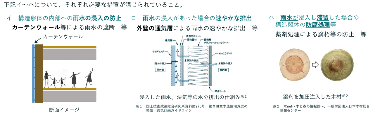 小久保 ガイドラインは、木造の非住宅建築物の耐久性を評価するための基準や枠組みを定めたもの。構造躯体の内部への雨水の浸入防止、雨水の浸入があった場合の速やかな排出、雨水が浸入し滞留した場合の防腐・防蟻処理が重要とされています。これらの措置が適切に講じられれば、木造建築物の耐久性(減価償却期間)を一般的な減価償却期間と切り離して50年以上にできることが期待されます。また、建築事業者や建築主と金融、会計、投資分野とが相互に連携しながら、ガイドラインに基づく取り組みを促進することで、資産価値の可視化を行い、木造建築物の普及と市場価値の向上に寄与することを目指すものです。具体的な評価の手法については、平面図や断面図、仕様書(仕上表)などの設計図書を、当社のような第三者機関が審査することが必要となります。