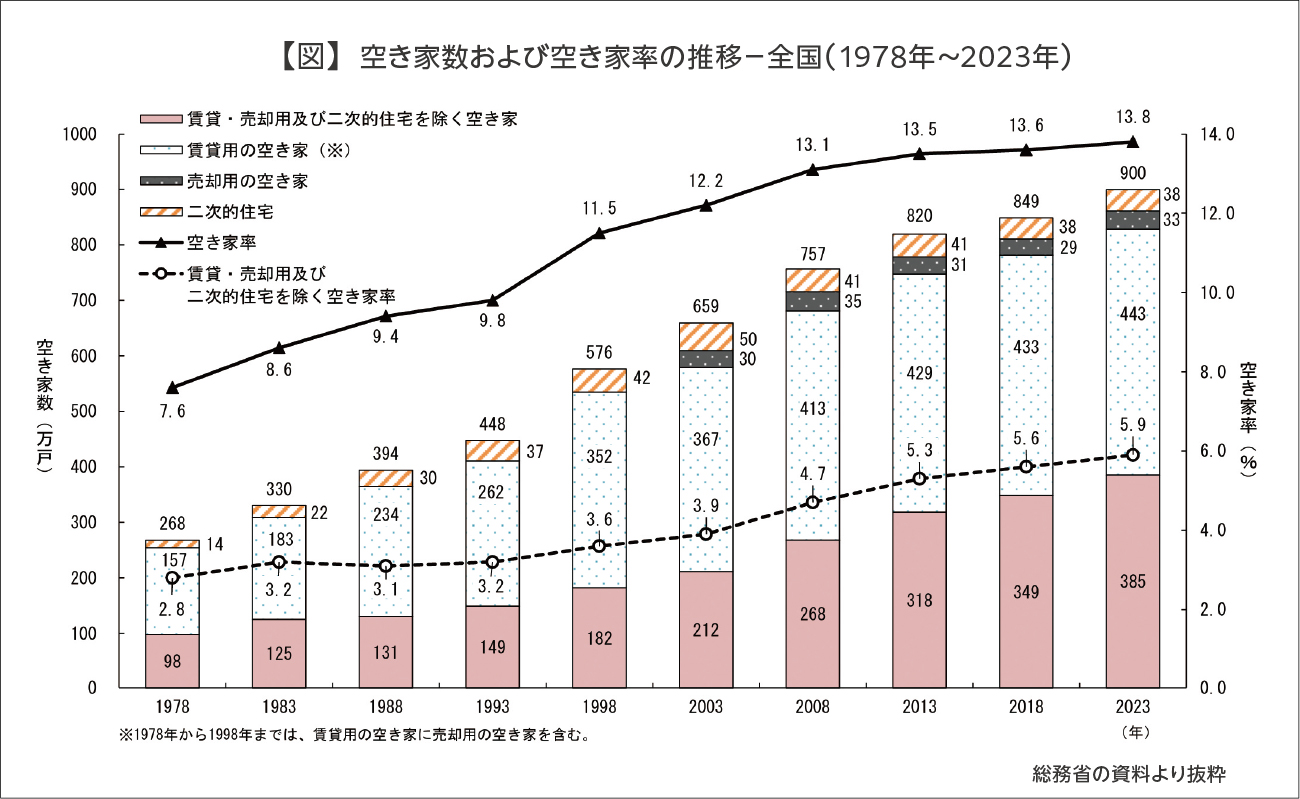 さて、総務省が公表した「2023年住宅・土地統計調査」によれば、同年10月1日時点で全国の空き家は900万2,000戸、空き家率は13.8%に達し、いずれも過去最高を更新した。日本の総住宅数に占める割合で見ても、7戸に1戸以上が空き家という計算になる。とくに「賃貸・売却用および二次的住宅を除く空き家」、つまり長期的に放置された住宅や取り壊し予定の建物などを指す「その他空き家」は385万6,000戸に上り、18年の前回調査から36万9,000戸増加した。総住宅数に占める割合は5.9%に達しており、増加傾向が鮮明である。【図】