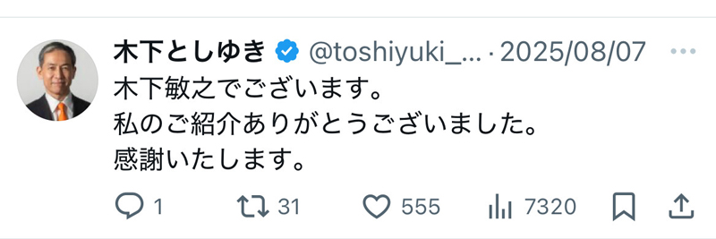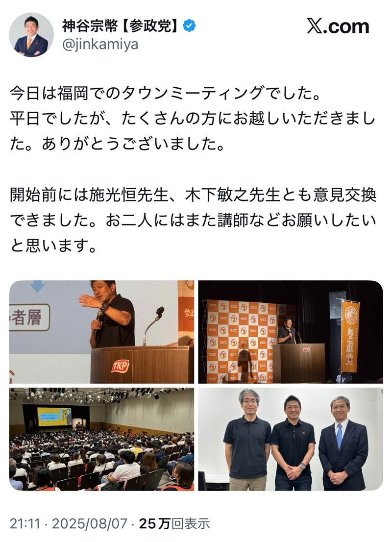 少なくともこの時期(17年から24年)に木下氏の姿を見かけたことはなかった。そこで龍馬プロジェクトから参政党に至る時期から現在まで、どの時点での接点だろうかと調べてみると、確認できたのは今年8月7日の福岡での参政党のタウンミーティングであった。神谷氏のSNSにも投稿があった。