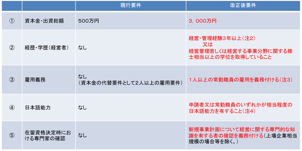 出入国在留管理庁は10日、日本で起業する外国人向けの在留資格「経営・管理」の取得要件を厳格化する内容を盛り込んだ省令の改正を発表した。8月に発表していた案の通り、資本金の要件を現行の500万円から3,000万円以上に引き上げるほか、雇用義務については従来、資本金または常勤職員2人の雇用のいずれかを要件としてきたが、1人以上の雇用を要件に盛り込んだ。