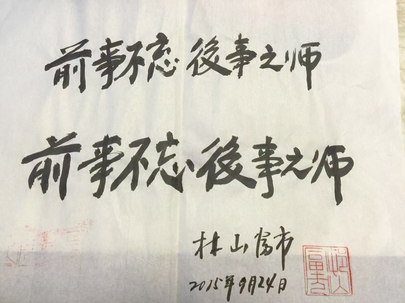 大分空港で出発待ちをしていた際、村山氏がくれた包みを開けてみた。本人直筆で、「前事不忘後事之師」(過去の経験を忘れず将来の戒めとする)との言葉が2つ書かれていた。村山氏からのずっしりと重い託しごとなのだ、と悟った。