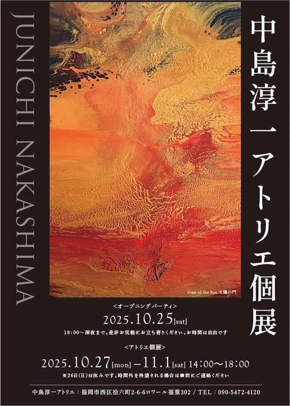 福岡市在住の異色の芸術家、劇団エーテル主宰の中島淳一氏。ニューヨーク、ドバイ、中国などでも個展を開催したことのある中島氏が27日から11月1日、自身のアトリエにて秋の個展を開催する。