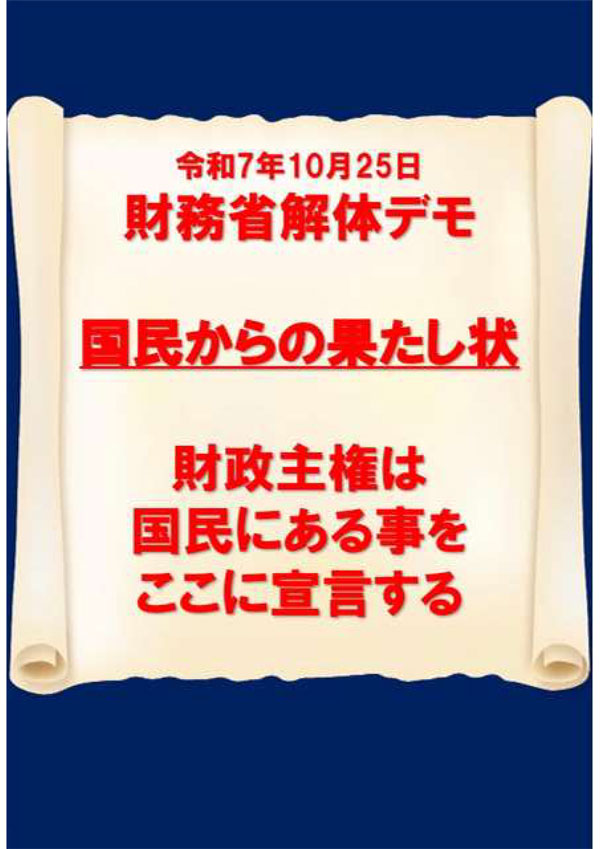 「全国結集! 財務省解体デモ」が10月25日、東京・霞が関の財務省前で開かれ、延べ150人が「国の借金」などを口実に緊縮財政政策を続ける財務省の在り方に抗議の意志を示した。「国税庁の分離」や「消費税廃止」などを求める『果たし状』を読み上げるとともに、ゲストとして4人が登壇。言論家の真田信秋氏は「財務省は通貨発行権があるから破綻しないと海外投資家には言っている。であれば、消費税を即刻廃止して貧困家庭を救いましょう」などと訴えた。