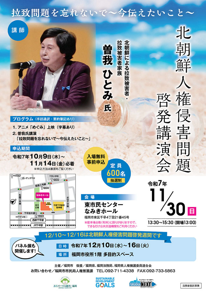 来る11月30日(日)、福岡市の東市民センターなみきホールで『北朝鮮人権侵害問題啓発講演会』を開催する。講師に拉致被害者である曽我ひとみさんを迎え、「拉致問題を忘れないで~今伝えたいこと」と題して語る。