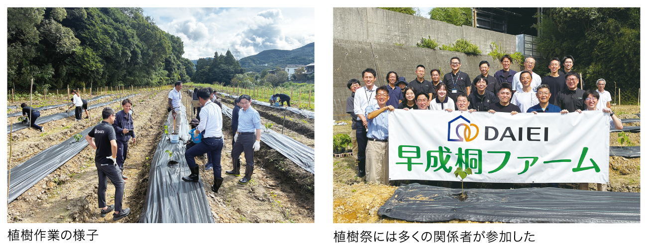 宇留嶋 早成桐とは、通常の桐は建材などとして利用できる成木となるのに約15年かかるのに対し、約5年で成木化し、CO2吸収力に優れ、伐採後も再生を繰り返す桐の品種です。24年10月に、九州地方における放棄農地の有効活用による産業創生や環境保全型産業の創出を図ること、そして循環型木造社会の構築を目的として、早成桐の知的財産・育成ノウハウを保有する(一社)クール・アース(東京都台東区)と業務提携契約を締結しました。25年9月には八幡西区内で134本植樹をいたしました。脱炭素社会の実現を図るうえでは、木造建築物を建設、普及するだけではなく、川上から川下まで全体を見通すこと、そして建築や内装、家具として活用する出口戦略を描き実行することがとくに大切で、それを実現しようとしているわけです。