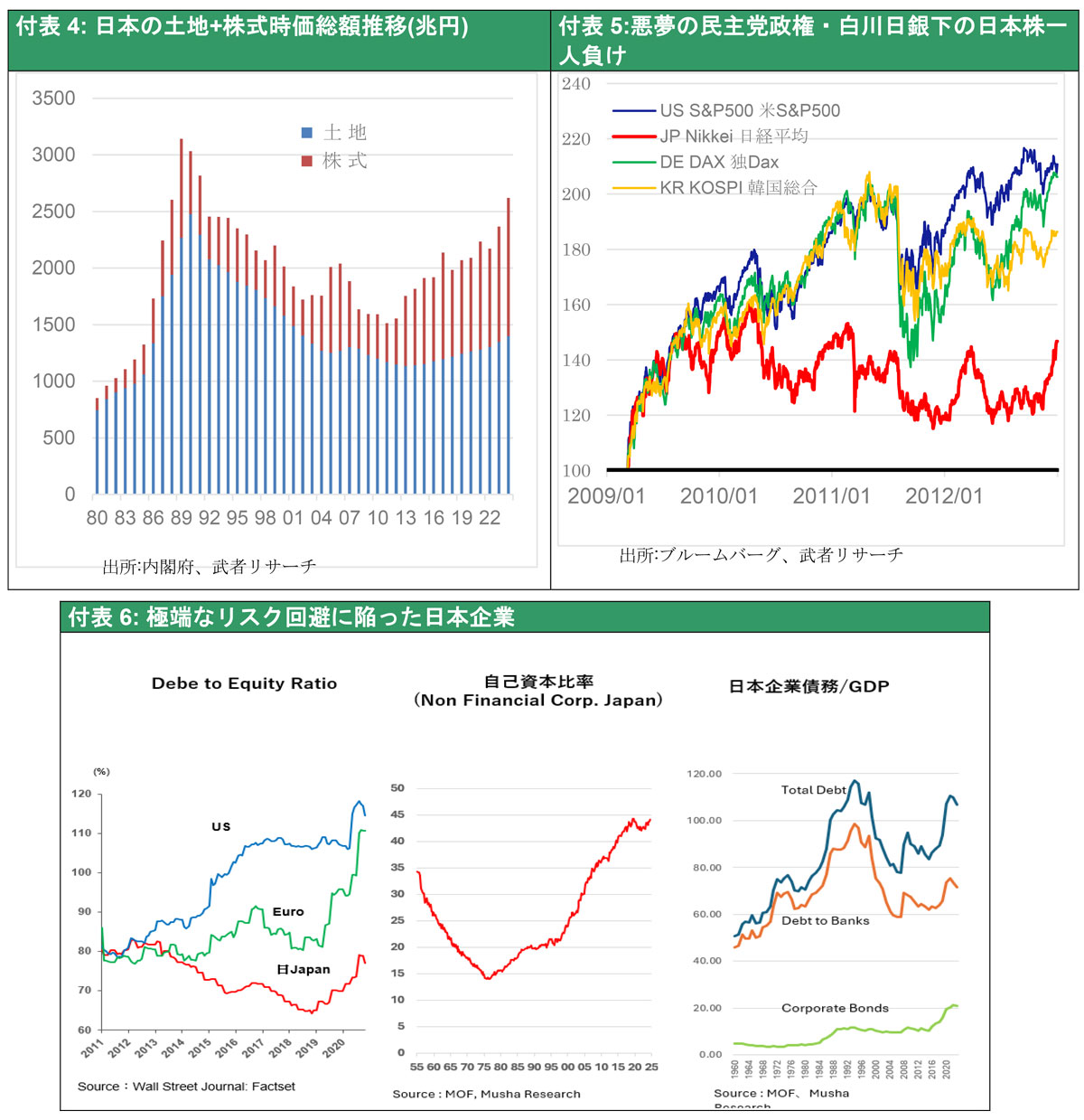 2)バブル崩壊が行き過ぎて株価・不動産価格が異常に下落し、巨額の値下がり損失によりアニマルスピリットが死滅した。それにデフレが重なり企業も家計も貨幣の偏愛(キャッシュイズキング)、過度のデレバレッジが進んだ。金融資産は家計保有分も企業保有分も際限なく高まったが、流通速度は急激に低下した。異常な資産価格下落、円安への手当は金融政策の責任範疇であり、米国ではバーナンキ議長が異常な資産価格の下落を立て直すために禁じ手と批判された量的金融緩和に踏み切った。それに対して日銀は全く手を打たなかった。