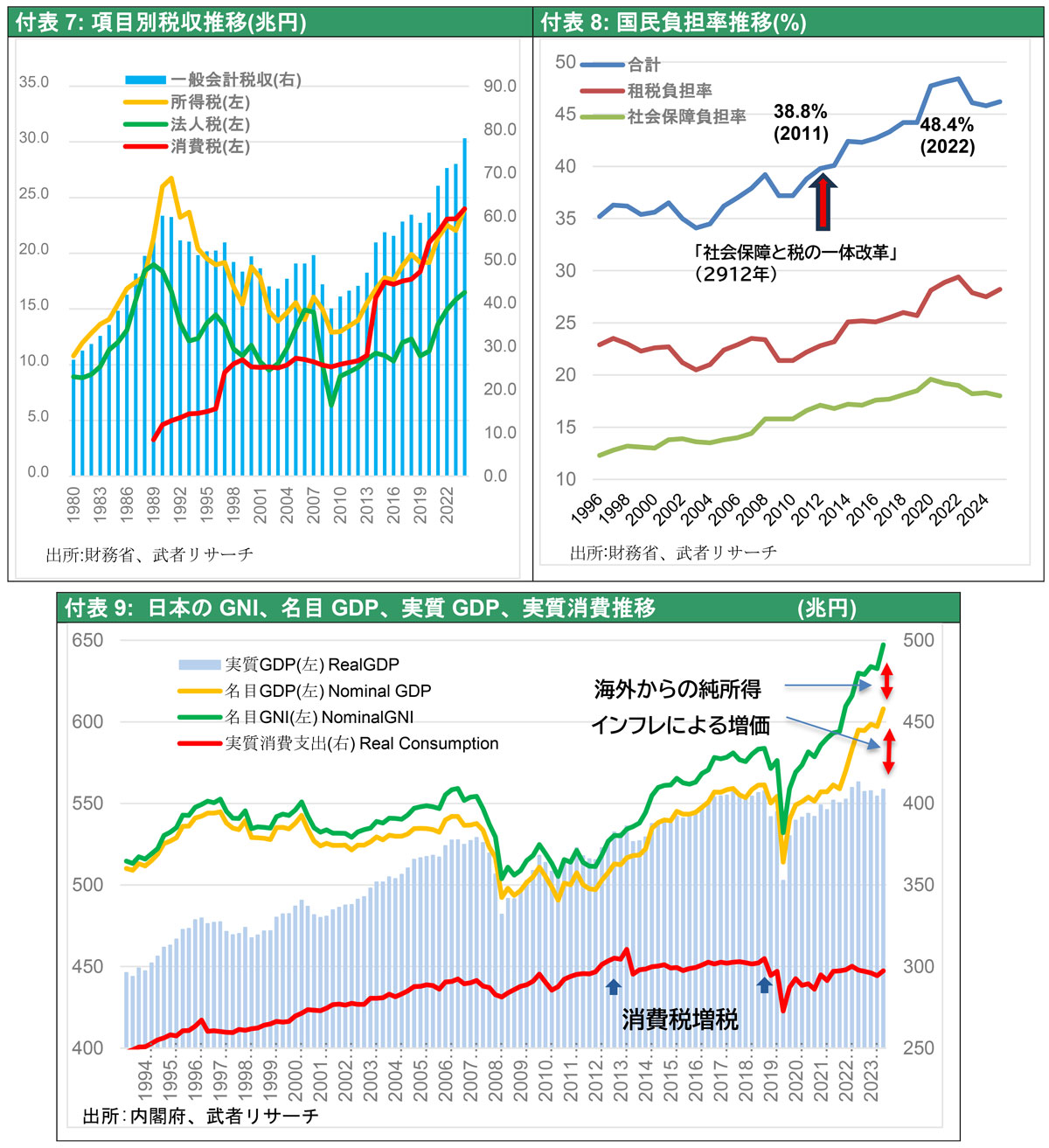 財務省は悲観論に便乗して、国民に高負担を受け入れさせてしまった。そのキーワードが「社会保障と税の一体改革」、キーパーソンは「立憲民主党の野田党首」である。「社会保障と税の一体改革とは、少子高齢化の進行とともに年金や社会保険の支出が高まる一方、働く人口は減っていく。したがって十分な給付を続けるためには増税による財政基盤の強化が必要だ」、「景気変動に影響されない安定財源である消費税増税が不可欠(消費税の福祉目的化)」と言うもの。その大キャンペーンの仕掛け人が財務省、主唱者が2012年に法案を成立させた当時の野田首相、現立憲民主党党首であった。野田氏は3党合意をタテに解散を遂行し(2012年)、安倍政権下での2度の消費税増税を約束させた。「一体改革」導入前の2011年の国民負担率(国民所得に対する租税と社会保険料負担率)は38.8%であったが2022年には48.4%と世界にも例のない10年で10ポイントの急上昇となり、家計消費を直撃したのである。家計実質消費は2014年3月の消費税増税(5→8%)直前の2014年1~3月の304兆円がピークで、その後一度もそれを上回らず、現在(2025年2Q)でも依然として10年前のピークに比べ4%減の水準で低迷している。この間企業利益は2.4倍、株式時価総額は3.7倍、一般会計税収は1.8倍になったわけで、家計がひとり犠牲にされてきたと言える(図表9)。