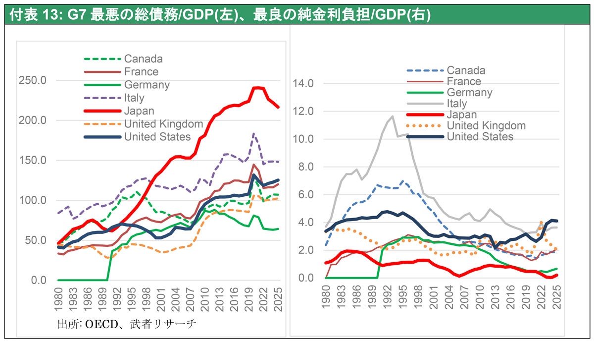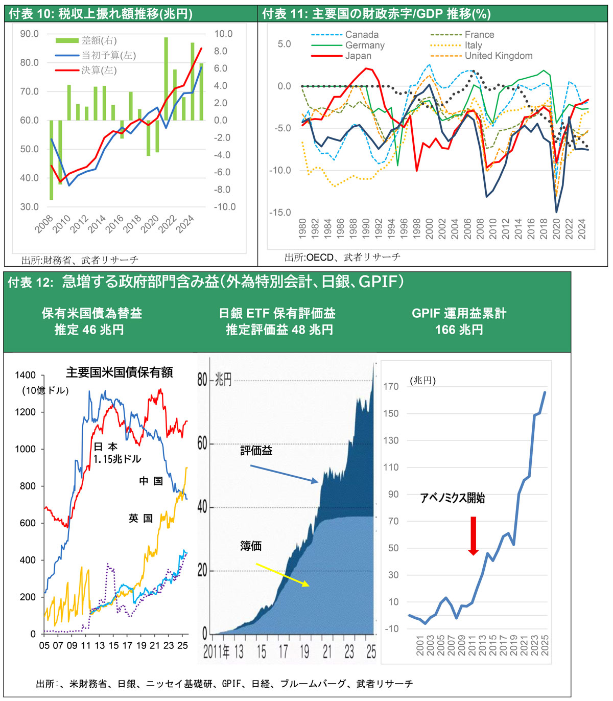 しかしここでうれしい驚きが起きた。悲観主義では想定していなかった想定外のインフレが起き円安も伴って名目GNI(名目GDP+海外所得)は4%の成長が定着し、税収が著しく増え経済のバランスが大きく崩れたのである。2021年以降、税収は当初予算を6~10兆円上回ることが常態化している(図表10)。税収上振れ額はGDPに対して1.0~1.6%に相当する。これを財政再建と言うことで政府内に留保しているので、民需は著しい押し下げ圧力を受けている。実際OECD(6月経済見通し付属データ)の一般政府財政収支対GDPをG7で比較すると、最も経済成長率が低い日本の財政赤字縮小が際立っていることが分かる。図表11に示す日本の財政赤字/GDPは2022年4.2%、2023年2.3%、2024年2.05%、2025年(E)1.6%とG7中で最小の赤字となっている。仮にインフレによる税の増収分がまるまる家計に還元されるとすれば、日本は米国並みの高成長が可能と言うことになる。加えて、米国国債保有の為替益40兆円、日銀ETF投資含み益50兆円、GPIF累積運用益166兆円等、巨額の隠れた投資原資もある。図表12をじっくりとご覧いただきたい。いかに高市政権の船出が財政余力に恵まれているかは、クリスタルクリアであろう。