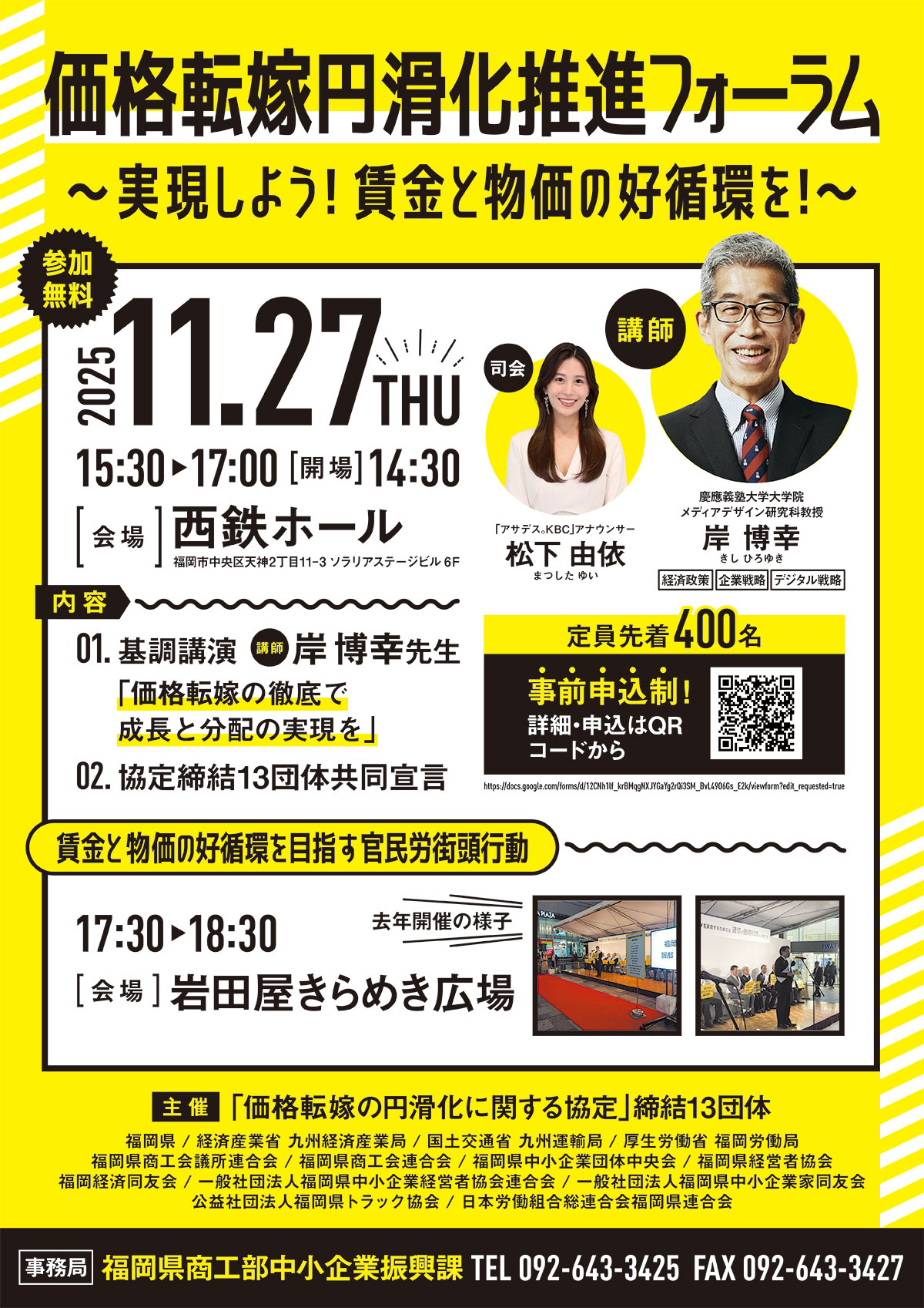 フォーラムでは「価格転嫁の徹底で成長と分配の実現を」と題する基調講演を実施する。講師は慶應義塾大学大学院メディアデザイン研究科教授の岸博幸氏。さらに、「価格転嫁の円滑化に関する協定」を締結した13団体による共同宣言も予定されている。司会は「アサデス。KBC」アナウンサーの松下由依氏が務める。